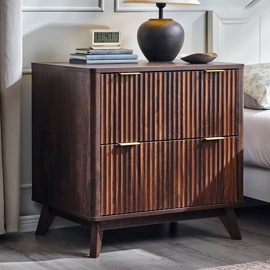 - Diseño acanalado elegante y moderno: eleva tu dormitorio con nuestra moderna mesita de noche, con un elegante diseño acanalado que añade una profundidad sorprendente y sofisticación táctil. La rica textura de grano de madera combina perfectamente con elegantes asas de metal, creando una mezcla perfecta de elegancia moderna y durabilidad funcional. Su perfil suavemente curvado garantiza una estética suave, mientras que las patas cónicas proporcionan una distribución excepcional del peso y una estabilidad sólida como una roca.