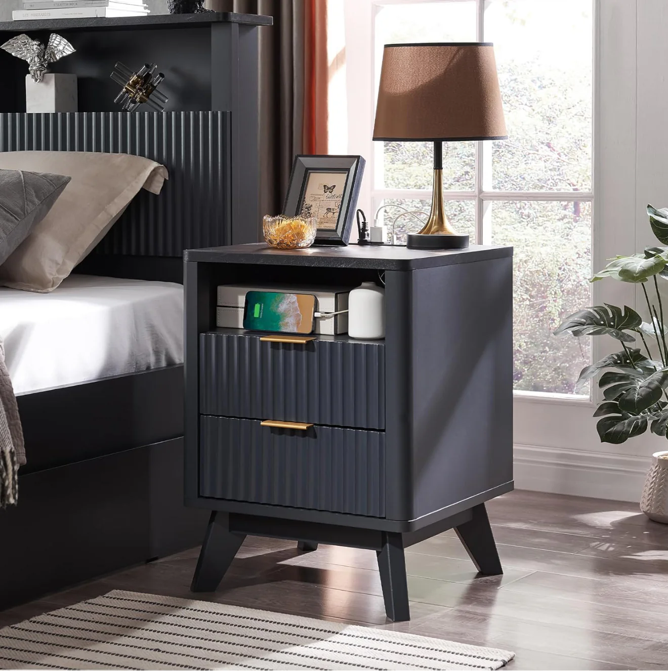 - La elegancia atemporal se une a la elegancia moderna: el distintivo panel acanalado de forma de onda mejora la textura y la presencia espacial de esta pieza excepcional. La parte superior de mármol sintético blanco sólido, adornada con vetas de piedra de tono gris claro, mientras que el borde curvado suave irradia un aura de elegancia. El amplio mango de metal y las patas extendidas añaden a su ambiente contemporáneo. Ten la seguridad de que con 2 salidas de CA y 2 puertos USB convenientemente ubicados a lo largo de la parte superior, esta mesita de noche tiene cubiertas tus necesidades de carga.