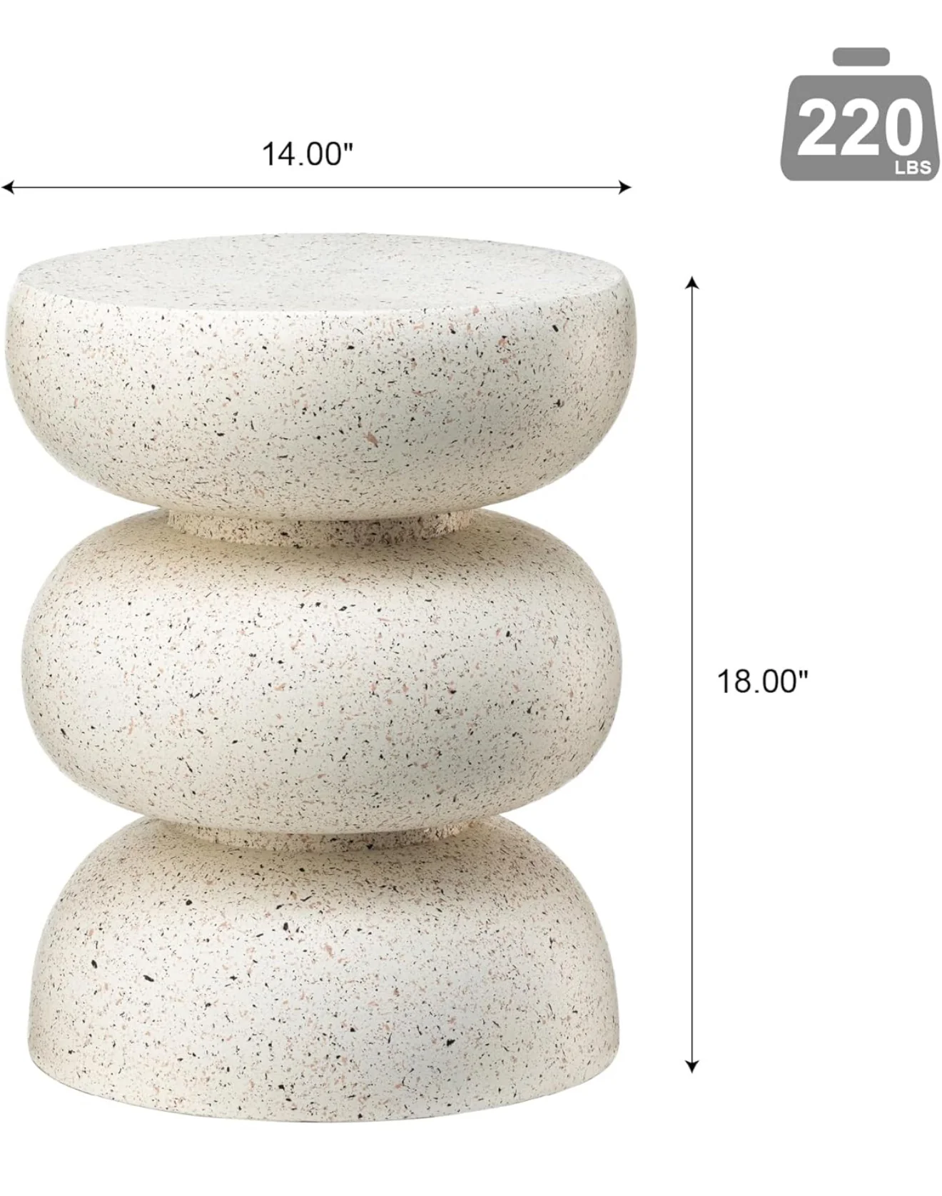 - Resistente y duradera esta mesa de acento blanco está hecho de MGO de alta calidad y fibra de vidrio, duradero y resistente a la intemperie para un uso prolongado. Tamaño: 36 CMS DE ALTURA x 45 CMS DE ALTURA (incluye un orificio de ventilación de 2.36 pulgadas en la parte inferior). La capacidad de peso es de 220 libras