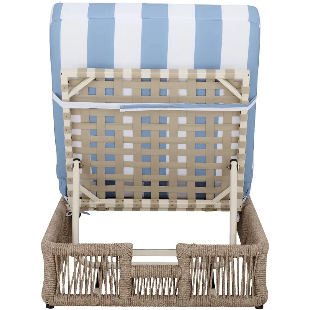 Su tejido en cuerda y cojines a rayas suaves aportan un aire relajado, mientras el respaldo ajustable se adapta a distintos momentos del día: descansar, leer o simplemente desconectar.